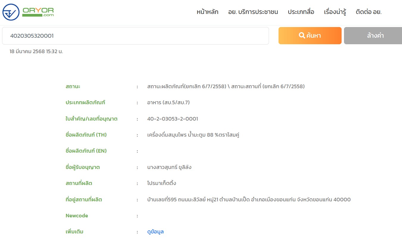 อยากให้ตรวจสอบสถานที่ผลิตน้ำดื่มฟ้าประทาน เลข อย 33-2-01658-2-0001 เนื่องจากเจ้า |