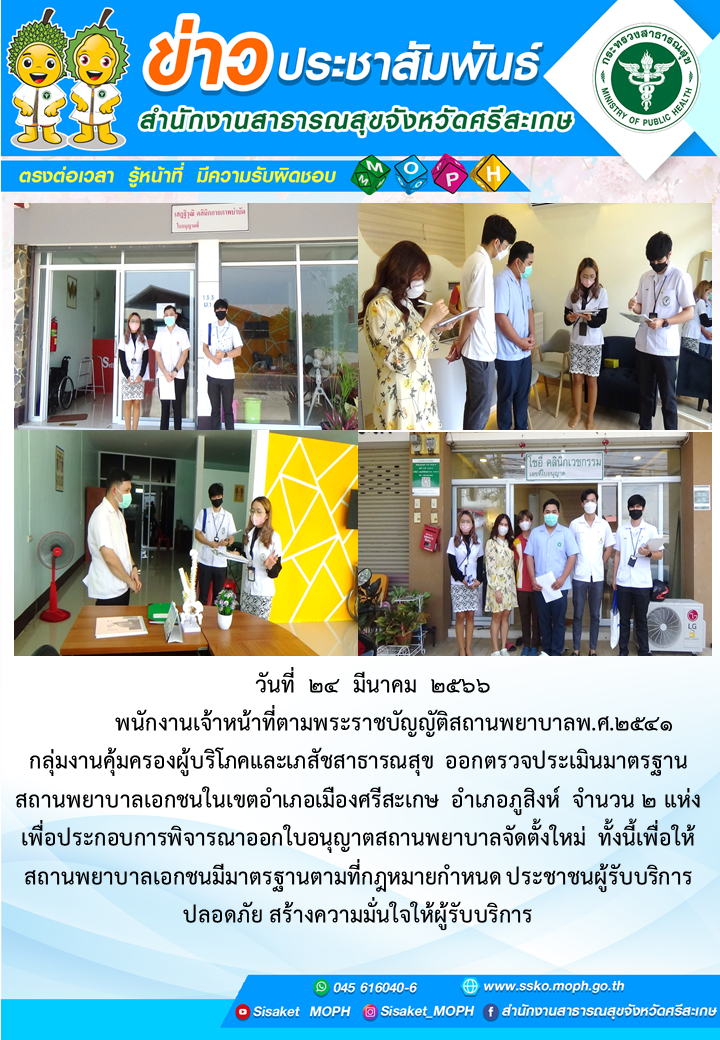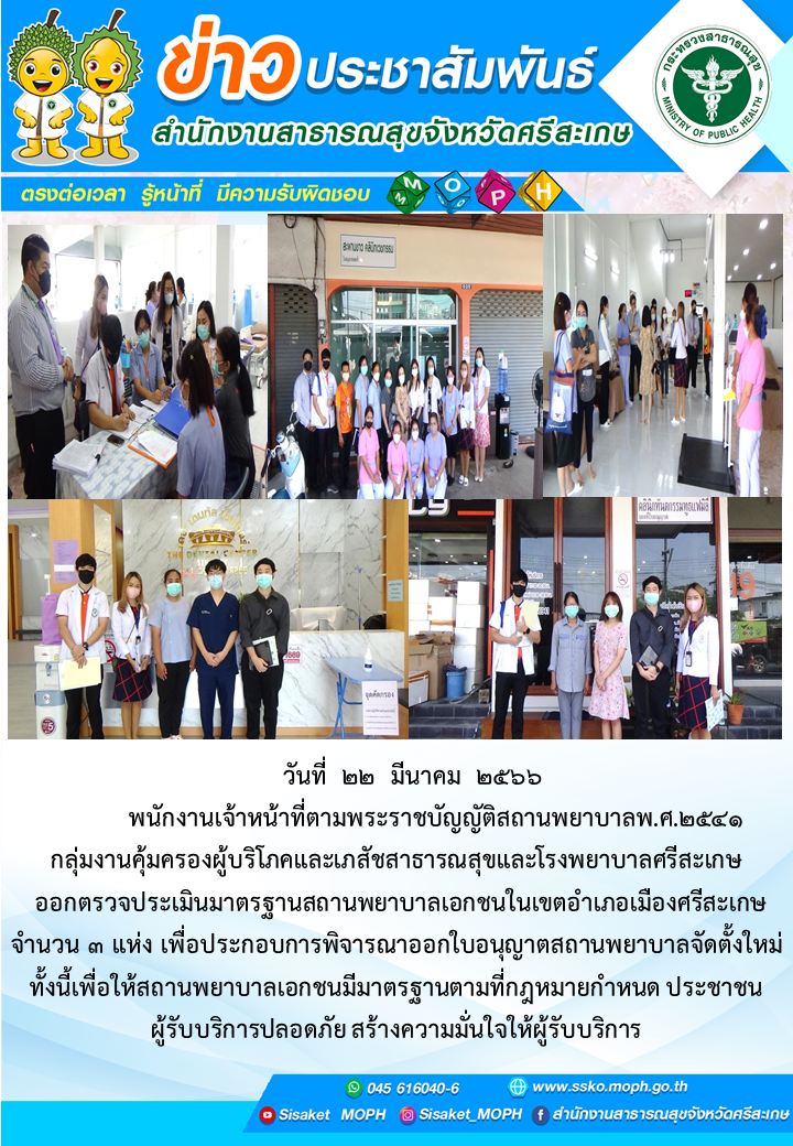 พนักงานเจ้าหน้าที่ตามพรบ.สถานพยาบาลพ.ศ.๒๕๔๑ กลุ่มงานคุ้มครองผู้บริโภคฯ และโรงพยาบาลศรีสะเกษ ออกตรวจประเมินมาตรฐานสถานพยาบาลเอกชนในเขตอำเภอเมืองศรีสะเกษ